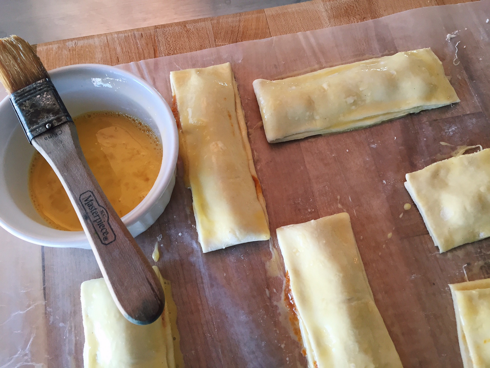 Crack one egg into a small bowl and whisk it up really well. Find a pastry brush, or even a clean (yes? I hope?) small paint brush, and if THAT fails, by God you can even use your clean (yes? I hope?) finger….and liberally paint your pastry sticks with the scrambled egg wash. Although these photos suggest otherwise, I like to smear on the egg wash after I get these little guys all sealed and poked. It works either way, and it will be perfect……